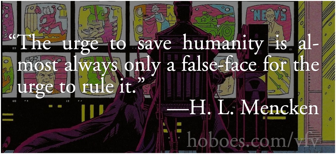 Moore’s stories aren’t just about overthrowing an oppressive regime. They’re about a superior being overthrowing an oppressive regime because normal humans won’t—they’re doing the job Britons, Americans, and the Worldly Wise won’t do. How much are they about the decline of mankind in favor of something else?