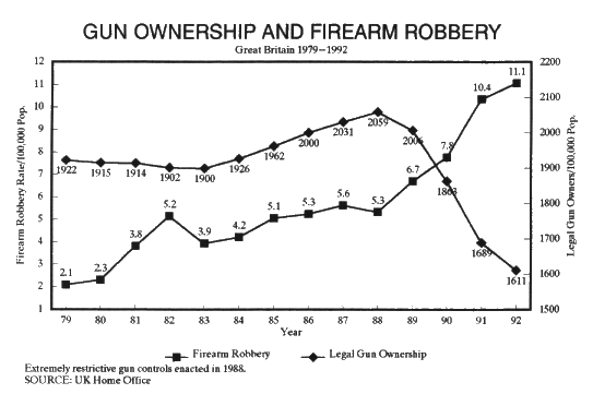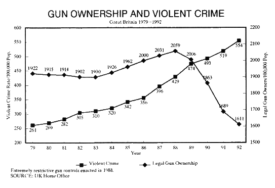 - A graph of England’s violent crime rate vs. its legal gun ownership, from 1979 to 1992.